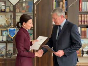 Зоряна Король вручила голові профспілкової організації ПНУ Василю Климончуку нагороду Профспілки працівників освіти і науки України за організацію літнього дитячого оздоровлення у 2023 році – почесний знак «Турбота про дітей».