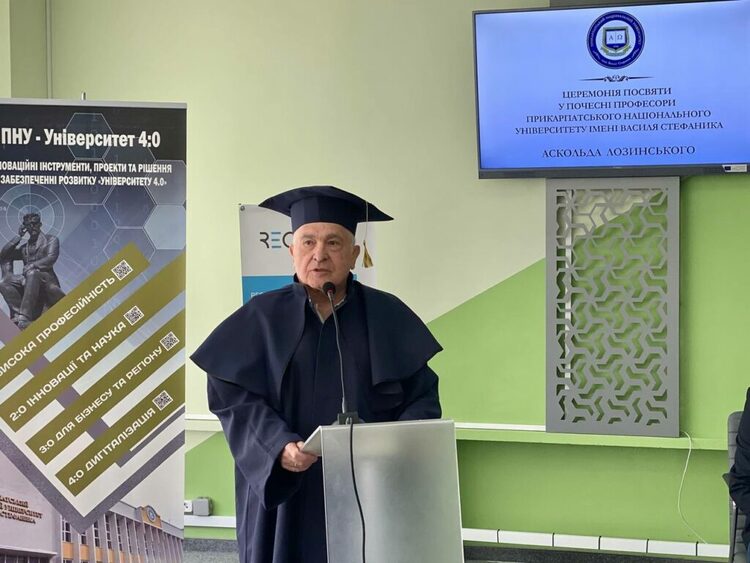 Сьогодні, 2 травня, ректор Прикарпатського національного університету імені Василя Стефаника Ігор Цепенда вручив диплом почесного професора Аскольду Лозинському – видатному політичному та громадському діячу, багаторічному Голові Світового Конгресу Українців, голові Фундації Українського вільного університету. Таке високе звання було присвоєно пану Аскольду відповідно до ухвали Вченої ради Прикарпатського національного університету імені Василя Стефаника 22 грудня 2023 року.