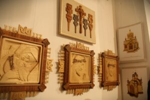 На огляд відвідувачів було представлено твори визначних гуцульських художників-різьбярів, а саме: Петра Корпанюка, Мирослава Радиша, Богдана Ходана, Миколи Стринадюка. Усі навчались у Косівському художньому училищі, тому вирішили об’єднатись та продемонструвати власні мистецькі здобутки. Тут представлена сучасна гуцульська різьба, розмаїття технік та експериментальних стилів. Усіх знаних та талановитих майстрів об’єднала любов до дерева, кожне з них має своє бачення та персональний стиль.