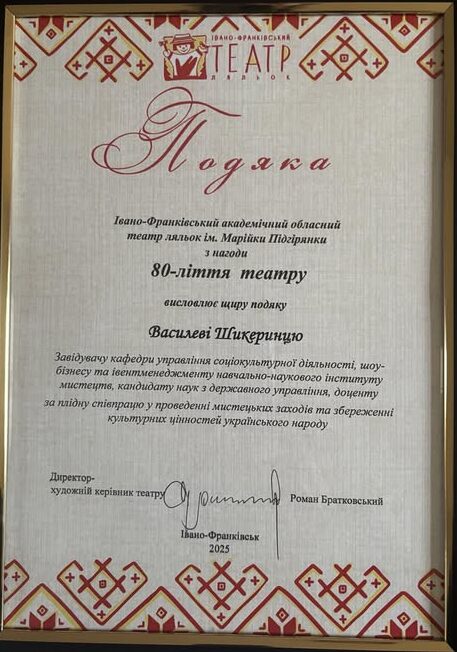 Вітаємо завідувача кафедри управління соціокультурною діяльністю, шоу-бізнесу та івентменеджменту Шикеринця В.В. із отриманням Подяки від одного із наших основних стейкхолдерів. Дякуємо за співпрацю!