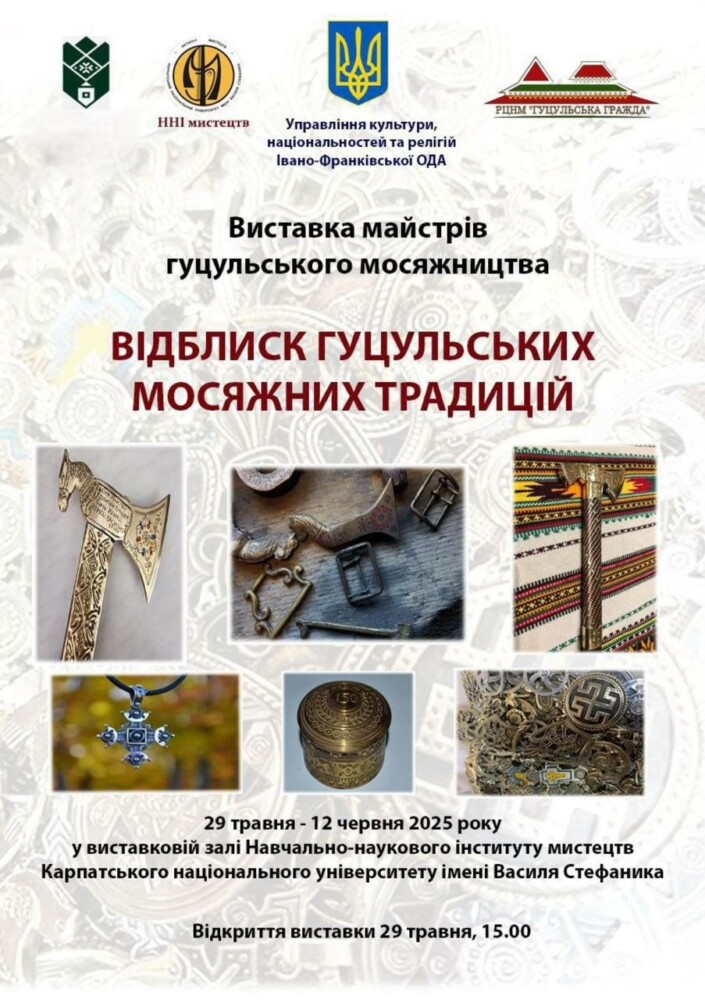 Виставка майстрів гуцульського мосяжництва 29 травня о 15:00 год у виставковій залі Навчально-наукового інституту мистецтв проходитиме виставка майстрів гуцульського мосяжництва “Відблиск гуцульських мосяжних традицій”.