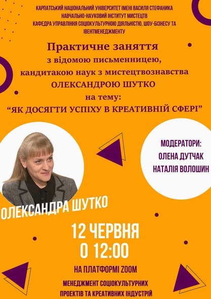 Цікавим та змістовним для студентів ОП Менеджмент соціокультурних проектів та креативних індустрій та ОП Менеджмент соціокультурної діяльності стало практичне заняття, проведене відомою письменницею Олександра Шутко Центральною темою заняття було запитання – “Як досягти успіху в креативній сфері?” Рецепт успіху відомої письменниці простий – ” Я роблю те, що мені подобається і наполегливо працюю.”