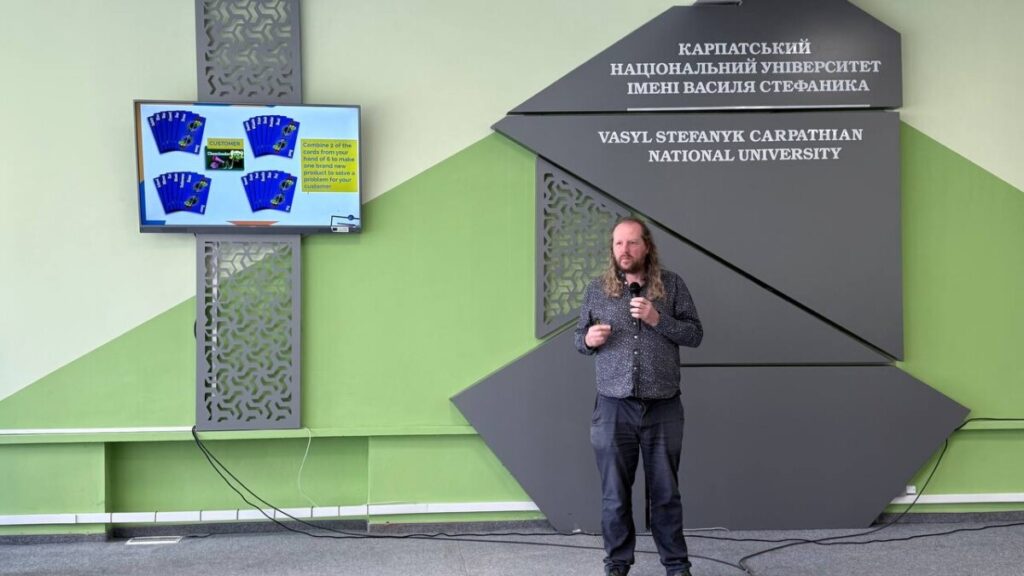У Карпатському національному університеті імені Василя Стефаника відбувся воркшоп, присвячений розвитку навичок пітчингу — однієї з ключових компетентностей у сфері підприємництва та професійної комунікації. Спікером заходу став Фінбар Картер, фахівець із розвитку студентського підприємництва Університету Східної Англії (University of East Anglia), який поділився зі студентами практичними підходами до ефективної презентації ідей, структурування виступу та переконливої комунікації. Під час воркшопу учасники дізналися, як чітко формулювати та презентувати свої ідеї, ефективно взаємодіяти з аудиторією й привертати увагу до власних проєктів.