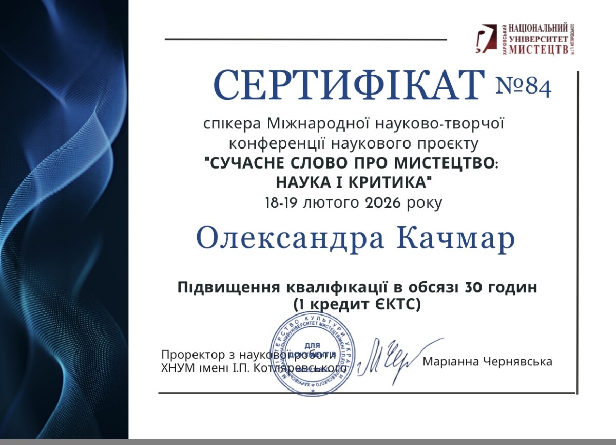 3.Тези конференції : Качмар О.“Механізми сприймання творів великої форми на уроках мистецтва”. Матеріали Всеукраїнської науково-практичної інтернет-конференції “Нові педагогічні виміри професійного розвитку майбутніх вчителів: сучасні реалії та виклики”. Бердянський державний педагогічний університет. 15 листопада 2022р. С.302-305.