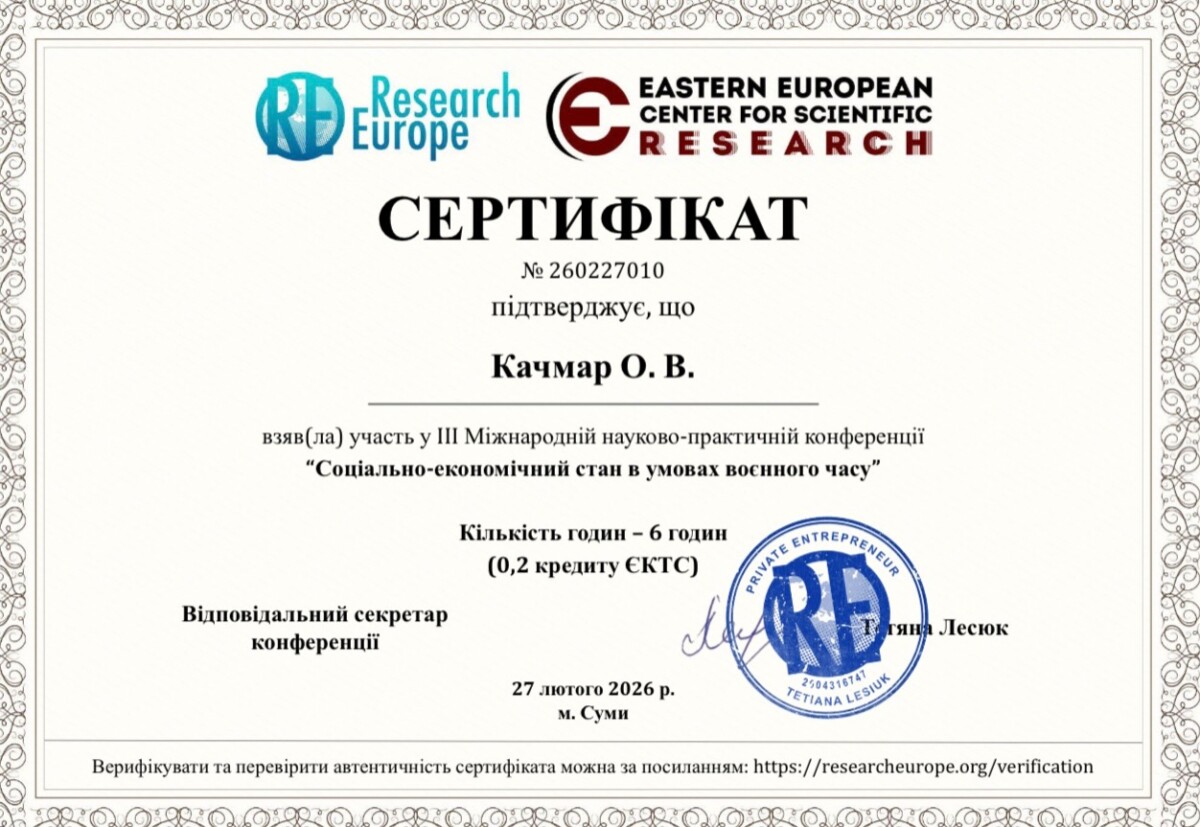 – Міжнародне наукове стажування: Вища Школа Лінгвістична Республіка Польща (м. Ченстохова, 2020р.)