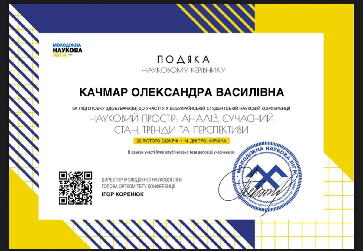 1.Dmytro Dzvinchuk, Oleksandra Kachmar A look into the Future: cyber aggression as the problem of interaction in space exploration . Philosophy and Cosmology. Kyiv. 2018. Volume 21 . Academic journal. Kyiv: ISSN 2518-1866 (online). p. 54-61. Фахове науково -метричне видання (Web of Science).